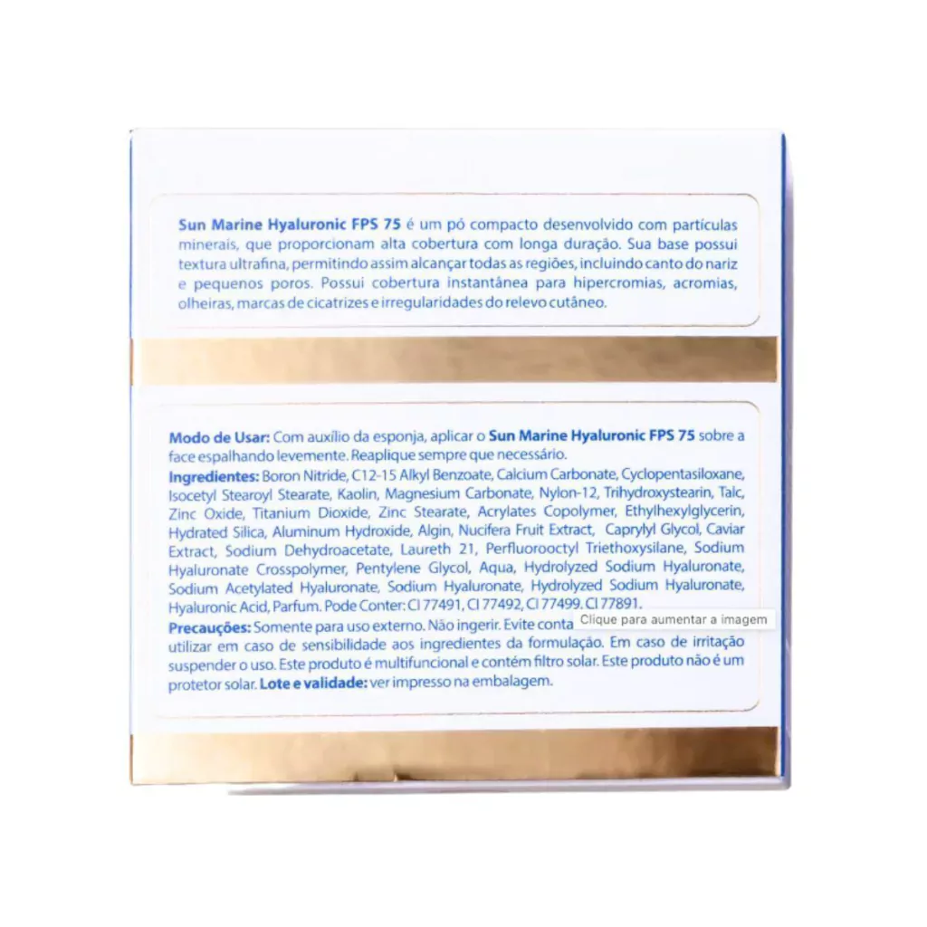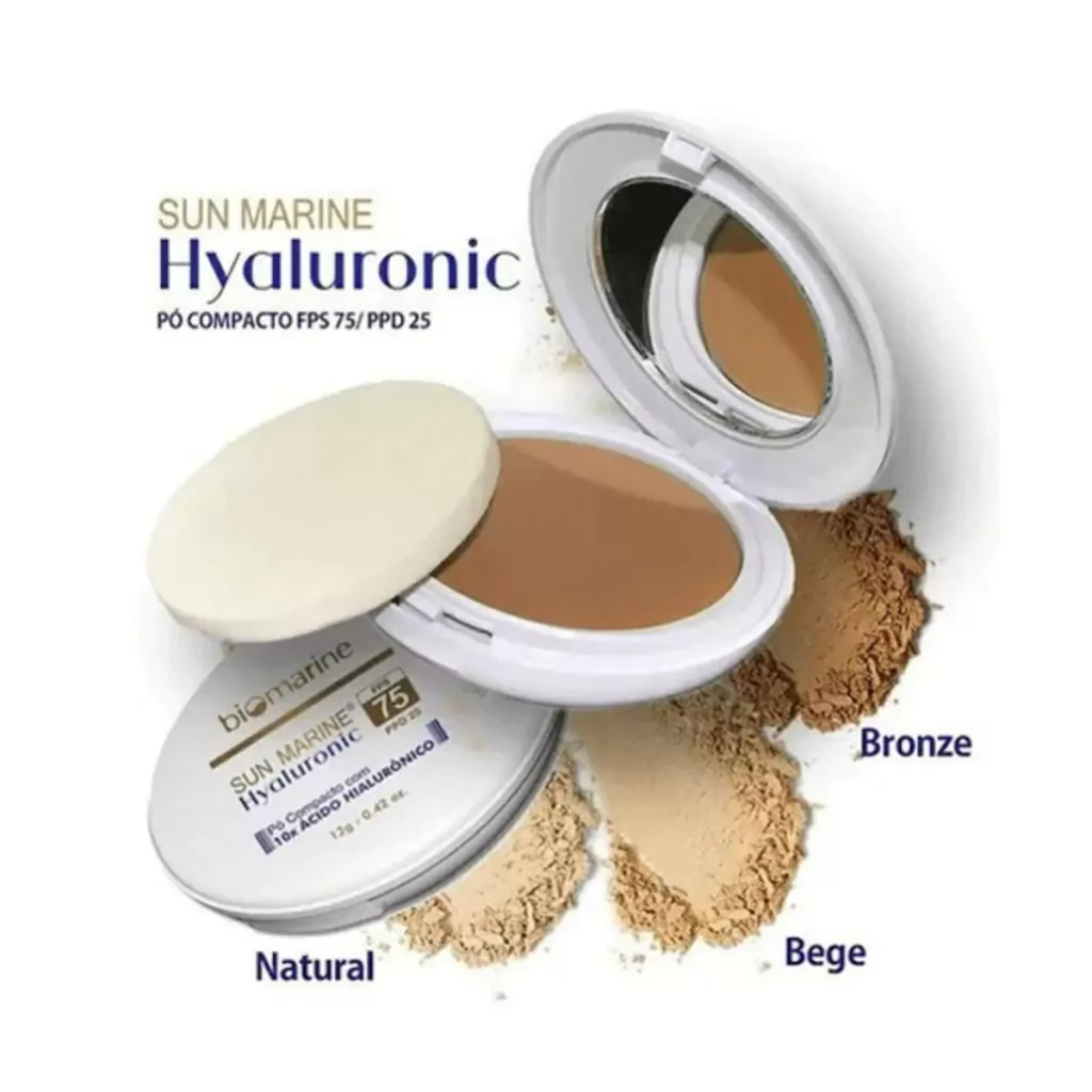 Pó compacto com proteção solar. Biomarine Sun Marine Hyaluronic FPS 75 proporciona alta cobertura, efeito matte e resultado de longa duração. Conta com 10 tipos de Ácido Hialurônico para garantir intensa hidratação e suavizar linhas de expressão.