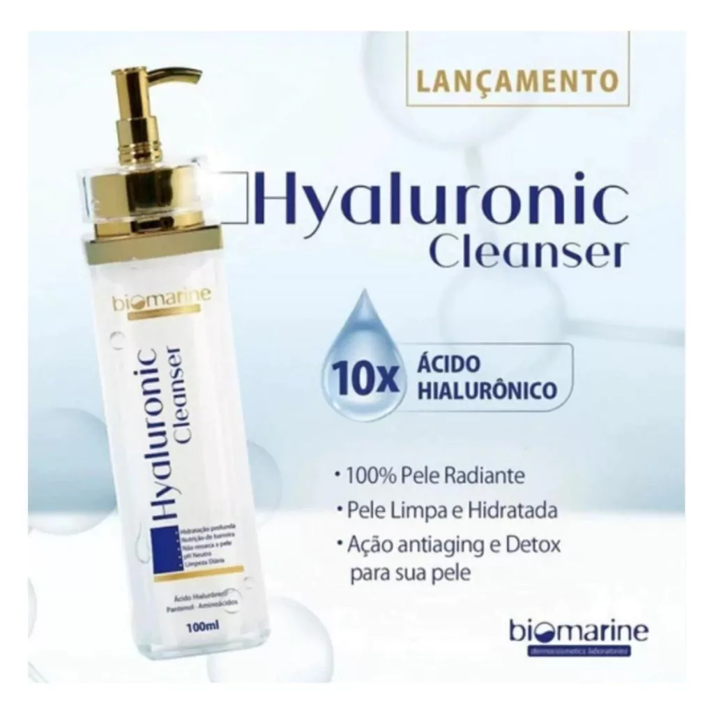 Biomarine Hyaluronic Cleanser conta com 10 tipos de Ácido Hialurônico que atuam na hidratação intensa. Assim, oferece limpeza eficaz sem ressecar a pele.