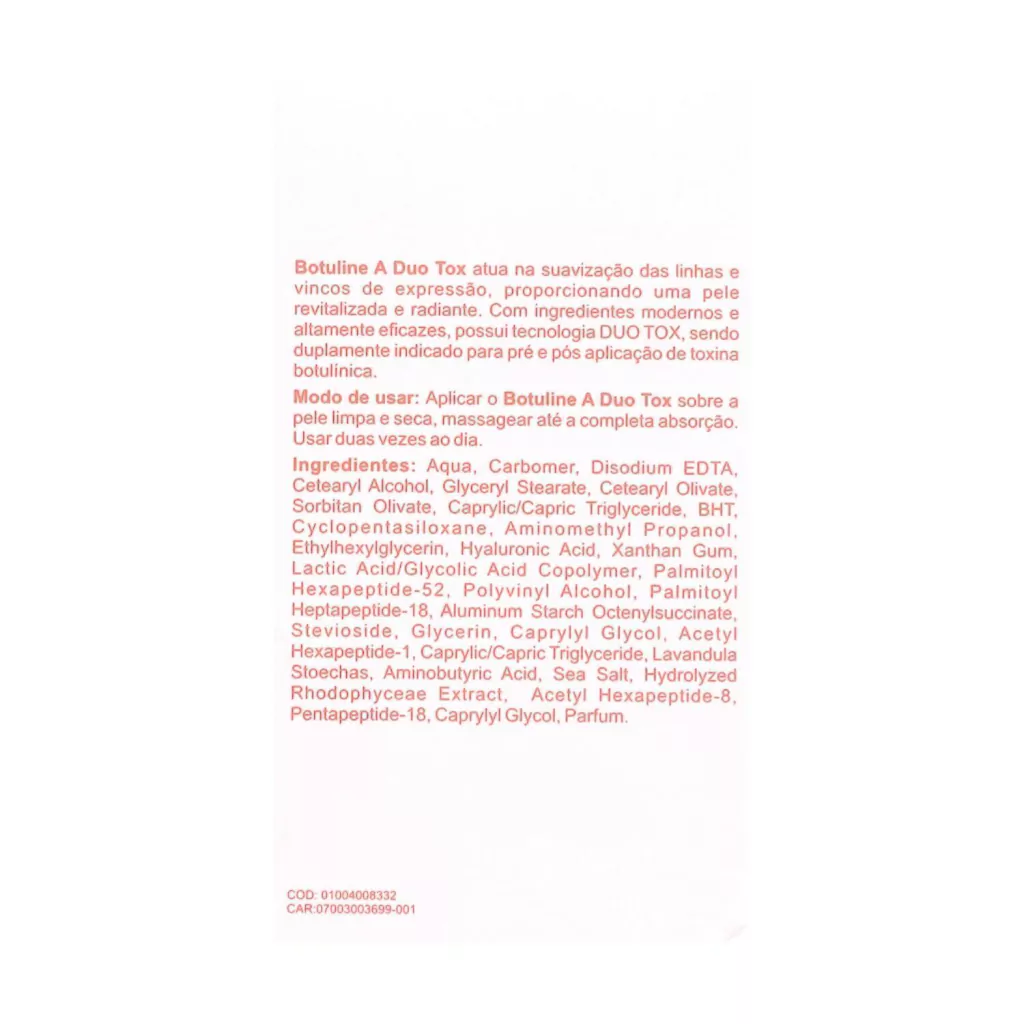 Aplicar o Botuline A Duo Tox Sobre a pele limpa e seca, massagear até a completa absorção. Usar duas vezes ao dia.