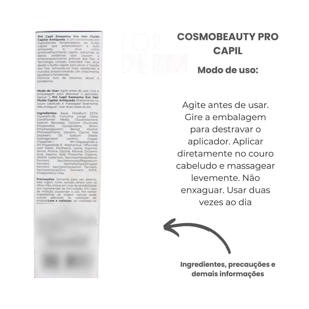 Agite antes de usar. Gire a embalagem para destravar o aplicador. Aplicar o Pró Capil Exossoma Exo Hair Fluído Capilar Antiqueda diretamente no couro cabeludo e massagear levemente. Não enxaguar. Usar duas vezes ao dia.