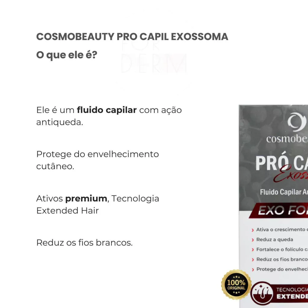 Pro Capil Exossoma Exo Hair Fluído Capilar Antiqueda é um concentrado em ingredientes fortalecedores do bulbo capilar que potencializam a ação antiqueda, e, atua como antienvelhecimento capilar reduzindo os danos oxidativos que causam o embranquecimento precoce dos fios. A Tecnologia Unissex Extended Hair atua desde o bulbo para ativar a fixação dos fios, tornando-os mais resistentes e nutridos proporcionando um crescimento saudável e fortalecido.