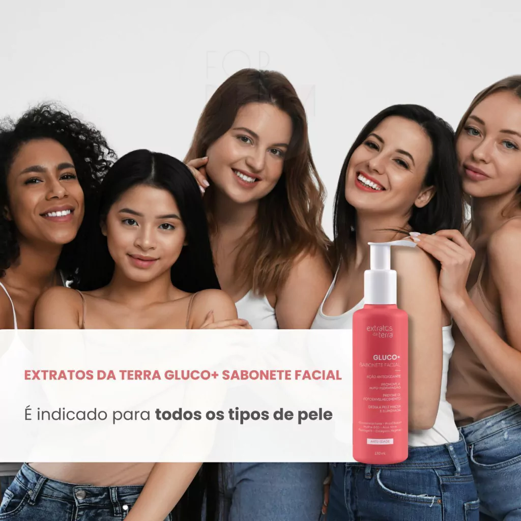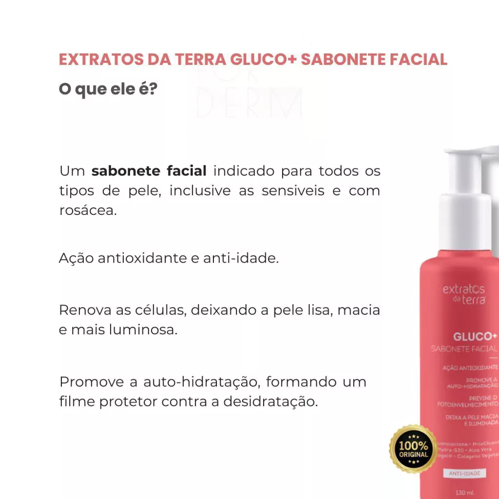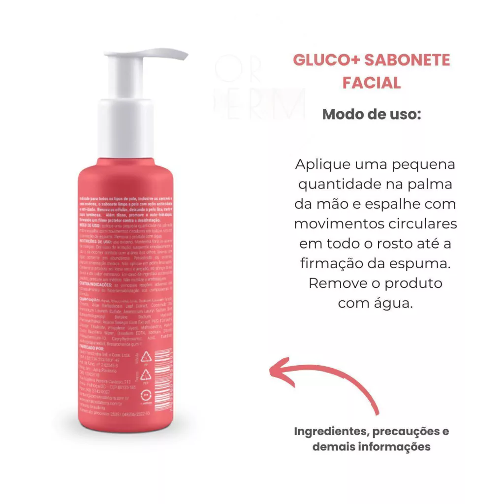 O sabonete facial Gluco+ foi desenvolvido com um blend de ingredientes que melhoram a aparência das peles envelhecidas. Ele limpa a pele de forma adequada e sem causar desconforto ou irritação. Promove a renovação das células e possui ação antioxidante e hidratante, que melhoram a luminosidade da pele, devolvendo o seu brilho natural. Além disso, repõe vitaminas, minerais e outros componentes necessários para formar um filme protetor sobre a pele que evita a desidratação e ao mesmo tempo promove uma auto-hidratação. Como resultado, o sabonete deixa a pele com toque sedoso, macio e extremamente confortável.